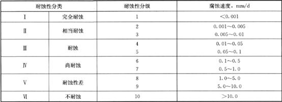 在工业上,一般用腐蚀速度表示材料的耐蚀性。腐蚀速度用单位时间内单位面积上金属材料的损失量来表示;也可用单位时间内金属材料的腐蚀深度来表示。工业上常用6类10级的耐蚀性评级标准,从I类完全耐蚀到VI类不耐蚀,见表2。