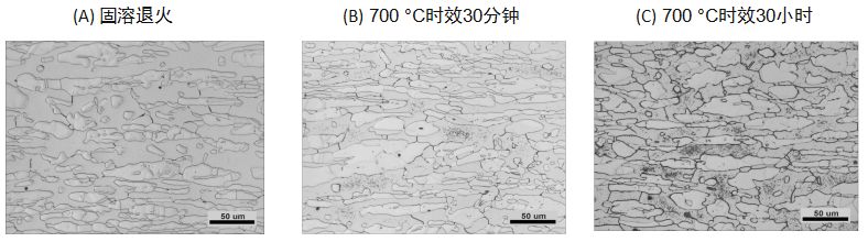 可见,发生过氮化物析出和性能损失的样品,经NaOH侵蚀后的金相组织(图B和图C) 看上去与固溶退火的金相组织非常相似,采用NaOH侵蚀的方法很难发现氮化物析出。